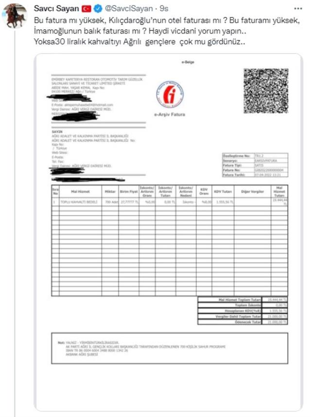 Olayın sosyal medyada hızla yayılması üzerine bir video paylaşan Savcı Sayan kahvaltının maliyetinin 21 bin lira olduğunu söyledi. Sayan, bu açıklamasını faturayı da paylaşarak desteklemek istedi. Ancak faturadaki bir hata dikkatlerden kaçmadı. Faturada rakamla 21.000 TL olan fatura tutarının yazıyla 20.000 TL olarak yazıldığı gözlendi.