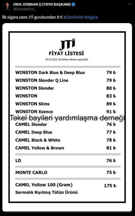Sosyal medya hesabından açıklama yapan Erol Dündar, "İlk zam JTİ grubundan" ifadelerini kullandı. Gelen zamla birlikte: