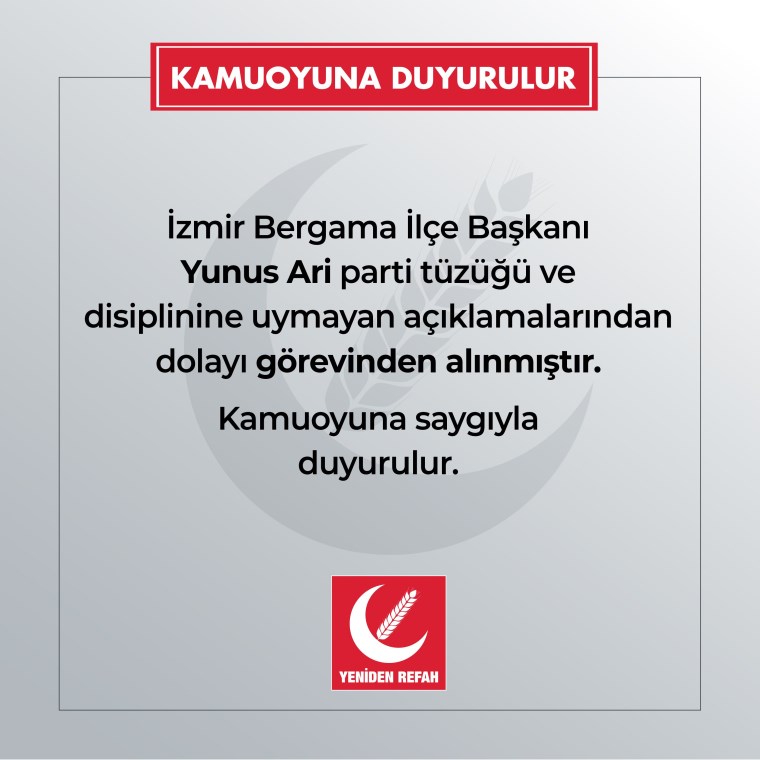 Yeniden Refah Partisi'nin X hesabından yapılan açıklamada İlçe Başkanı Yunus Ari'nin 'parti tüzüğü ve disiplinine uymayan' açıklamalarından dolayı görevinden alındığı açıklandı.