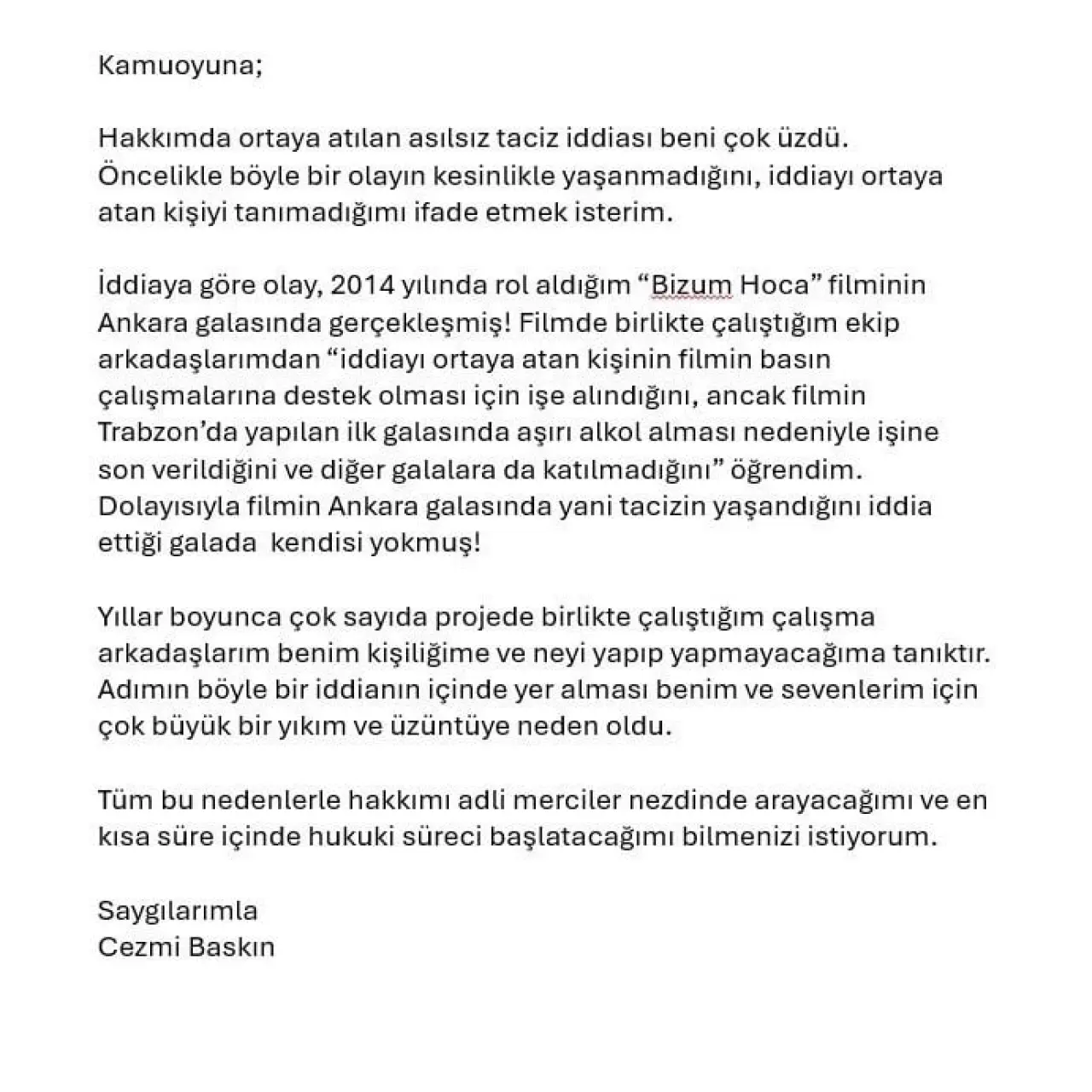 Uzun zamandır düşünüyorum, kendimi ifade etmeye çalışıyorum. Yeni fark ettim ki biz kadınlar kendimizi ne kadar özgür bırakırsak o kadar güçlüyüz. Cezmi Baskın, beni ‘Bizum Hoca’ filminin Ankara galasında taciz etti. Gece boyu telefonla arayarak tacizin boyutunu artırdı. O sırada odasına sığındığım PR sorumlusu ve bir kadın magazin gazetecisi, yaşadıklarıma şahit olmalarına rağmen beni suçladı. Ayrıca film için yaptığım çalışmaların karşılığı ödenmedi.