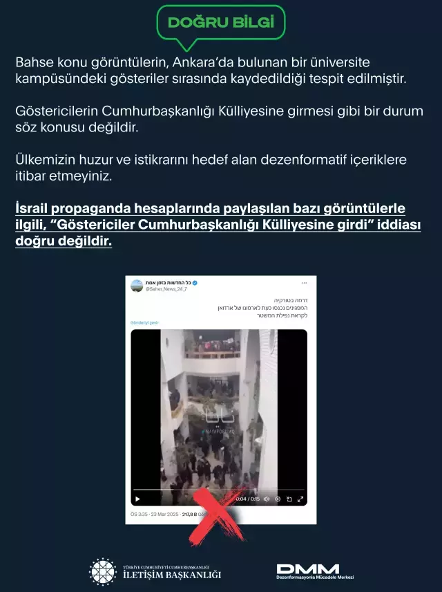 “Bahse konu görüntülerin, Ankara'da bulunan bir üniversite kampüsündeki gösteriler sırasında kaydedildiği tespit edilmiştir. Göstericilerin Cumhurbaşkanlığı Külliyesi'ne girmesi gibi bir durum söz konusu değildir. Ülkemizin huzur ve istikrarını hedef alan dezenformatif içeriklere itibar etmeyiniz.”