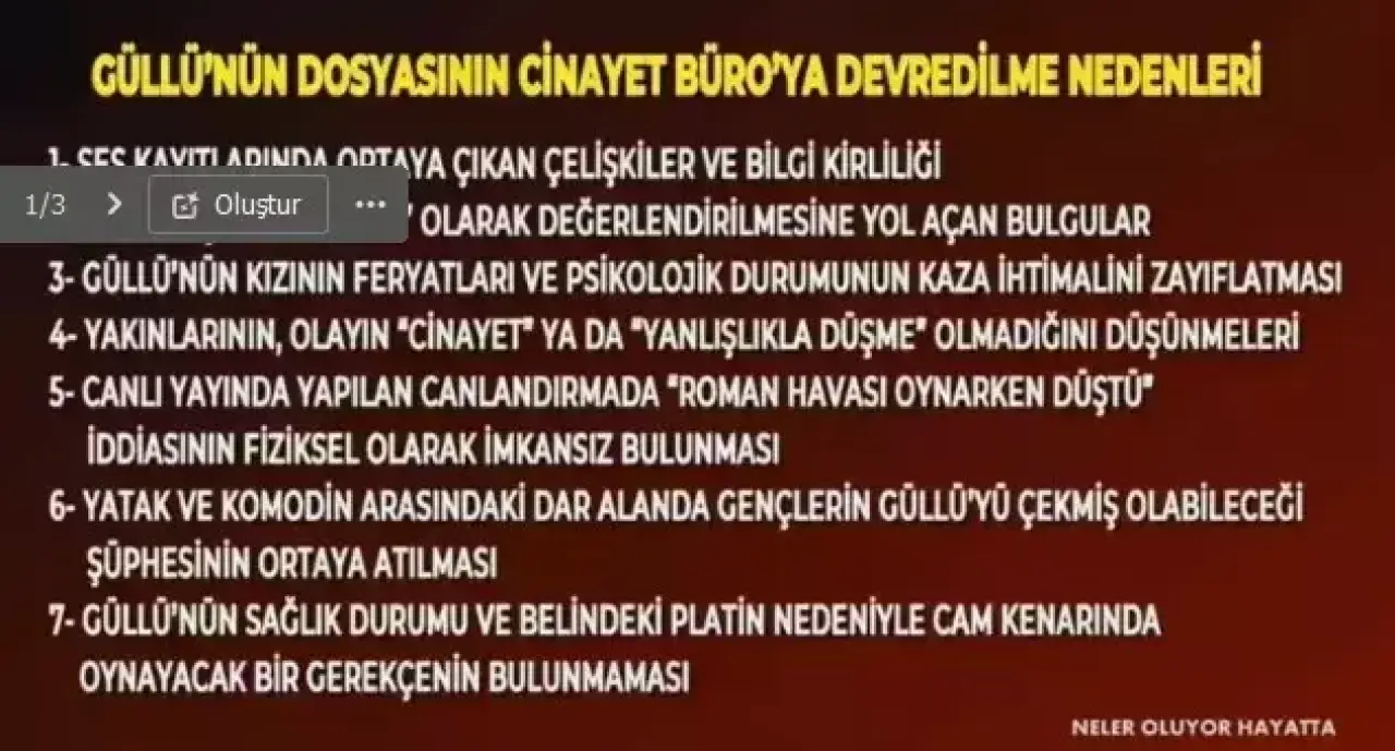 Güllü’nün kızının feryatları ve aile fertlerinin kaza ya da intihar ihtimaline kesin bir şekilde karşı çıkması soruşturmayı farklı bir boyuta taşıdı.