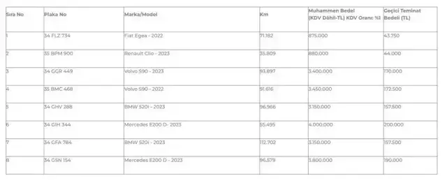Listede en uygun otomobil, 875 bin TL bedel ile ihaleye çıkacak 2022 model Fiat Egea olurken, en pahalı araç ise 3 milyon 800 bin TL bedel ile ihaleye çıkacak 2023 model Mercedes E200 D oldu.