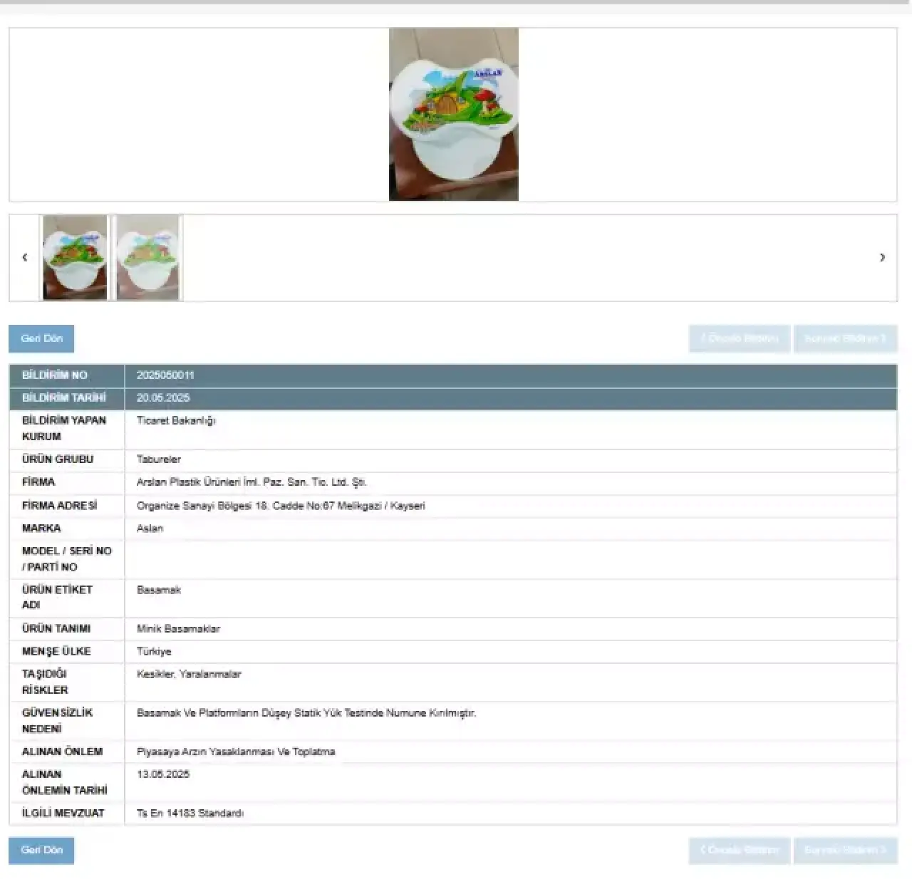 Yetkililer tarafından yapılan denetimlerde "Aslan" markasına ait bir taburenin, düşey statik yük testini geçemediği ortaya çıktı. “Minik basamaklar” şeklinde tanımlanan bu ürün, test sırasında kırıldı. Uzmanlar, bu durumun ciddi düşme ve yaralanma risklerine yol açabileceğini vurguluyor.