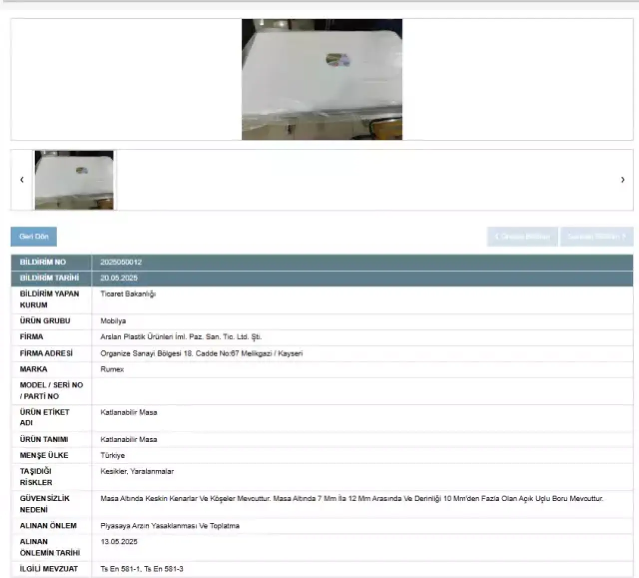 GÜBİS verilerine göre, piyasadan toplatılmasına karar verilen bir diğer ürün ise "Rumex" markasına ait katlanabilir masa oldu. Bu ürünün yasaklanma gerekçesi oldukça ciddi güvenlik sorunlarını barındırıyor. Denetim raporlarında yer alan bilgilere göre: