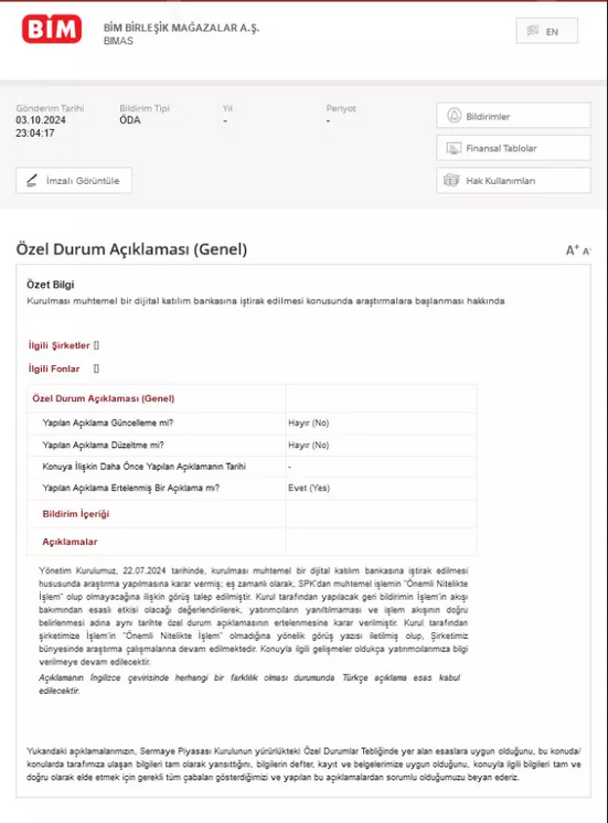 BİM’in bu yeni girişimiyle ilgili gelişmelerin KAP üzerinden yatırımcılara bildirilmeye devam edileceği de açıklamada yer aldı. Şirket, yapılan açıklamaların Sermaye Piyasası Kurulu’nun Özel Durumlar Tebliği'ne uygun olduğunu ve yatırımcıların yanıltılmaması adına tüm bilgilerin şeffaf bir şekilde paylaşılacağını taahhüt etti.