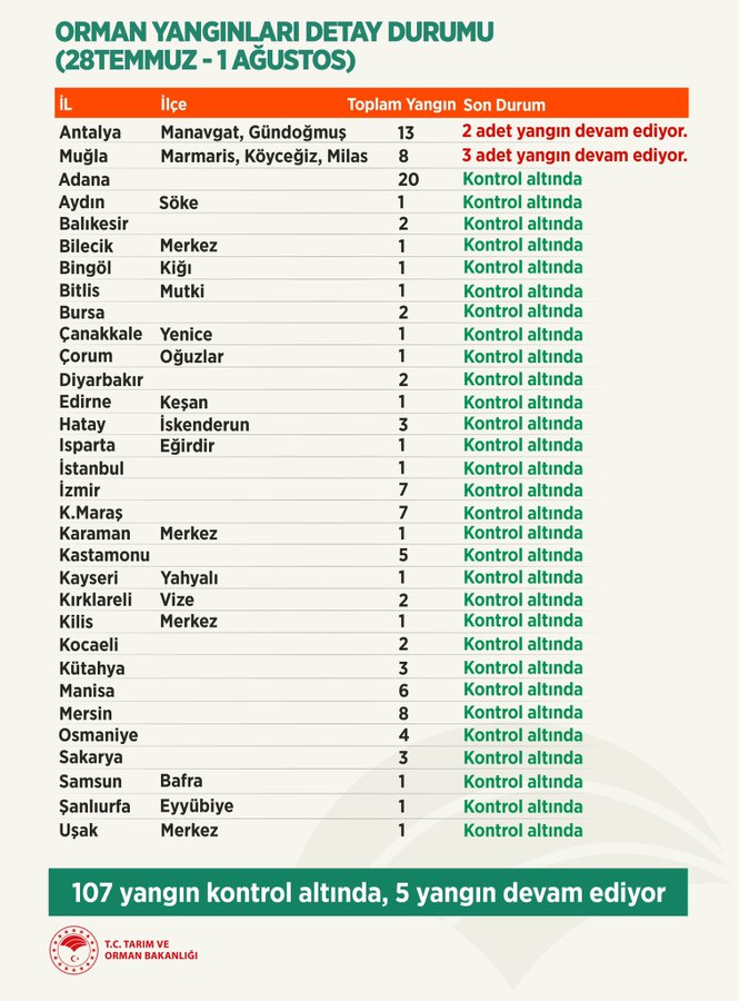 Tarım ve Orman Bakanı Pakdemirli, ülke genelindeki 112 orman yangınının 107'sinin kontrol altına alındığını bildirdi.