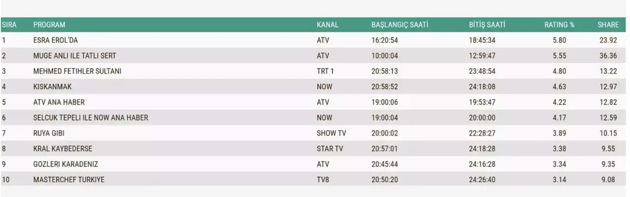 | Sıra | Program | Kanal | Başlangıç Saati | Bitiş Saati | Rating % | Share % |
