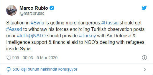 ABD'li Cumhuriyetçi Senatör Marco Rubio, kişisel Twitter hesabından İdlib'de yaşanan olayların gün geçtikçe daha da kötüye gittiğini belirterek açıklamalarda bulundu. Rubio, "Rusya, İdlib'deki Türk gözlem noktalarını çevreleyen Esad güçlerini geri çekmeli. NATO, Türkiye'ye hava desteği, istihbarat ve Suriyeli mültecilerle ilgilenen yardım kuruluşlarına finansal destek vermeli" açıklamasında bulundu.