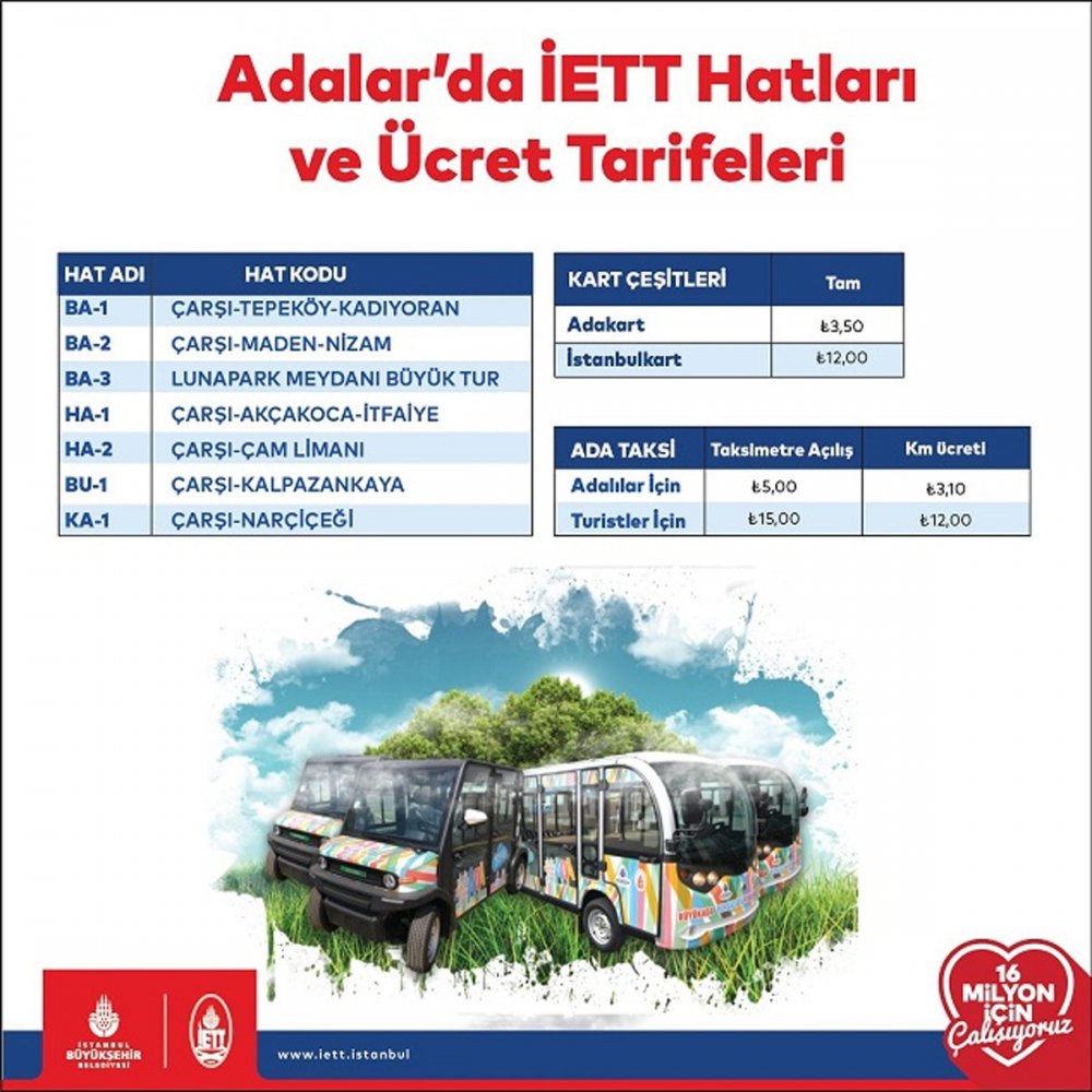 Ada Taksi'lerde ise Adalılar için taksimetre açılış ücreti 5 lira, kilometre başına ise 3 lira 10 kuruş ücret ödenecek. Turistler için ise açılış ücreti 15 lira ve kilometre başına ücret 12 lira olarak belirlendi.