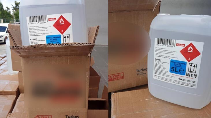 Depoda yapılan aramalarda "antifrizli cam suyu" ibareli koliler içerisinde üzerinde "tıbbi kullanım amaçlı etil alkol" yazan 2 bin 395 litre etil alkol ele geçirildi.