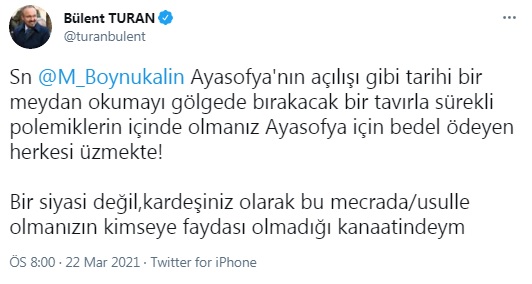 "Sn @M_Boynukalin Ayasofya'nın açılışı gibi tarihi bir meydan okumayı gölgede bırakacak bir tavırla sürekli polemiklerin içinde olmanız Ayasofya için bedel ödeyen herkesi üzmekte!