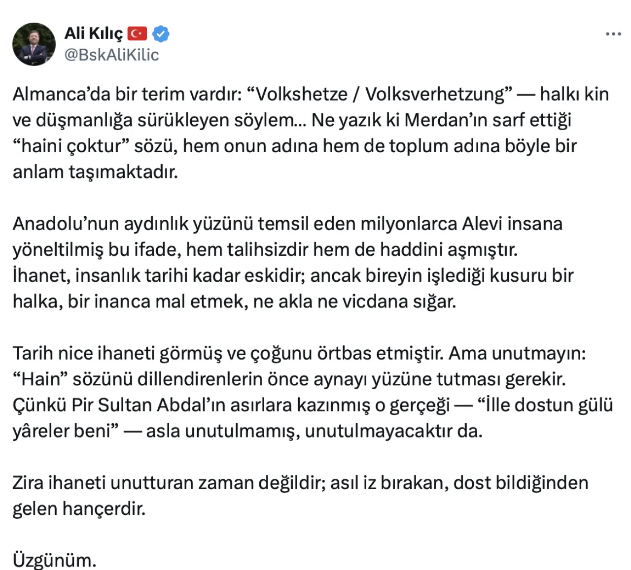 Eski Maltepe Belediye Başkanı Ali Kılıç, sosyal medya hesabından yaptığı paylaşımla gazeteci Merdan Yanardağ’ın “Alevilerin haini çoktur” sözlerine tepki gösterdi. Kılıç, Almanca’daki “Volkshetze / Volksverhetzung” (halkı kin ve düşmanlığa sürükleyen söylem) terimine atıfta bulunarak, bu ifadenin hem toplum hem de Yanardağ adına talihsiz ve haddini aşan bir söylem olduğunu açıkladı.