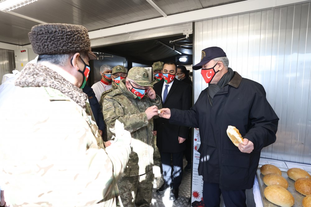Buradaki sahra fırın ünitesinde yapılan ekmeklerden birini bölerek Hasanov ile Komutanlara ikram eden Akar, yerli ve milli üretim zırhlı ambulansı da inceledi.