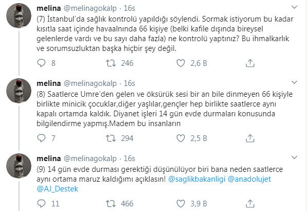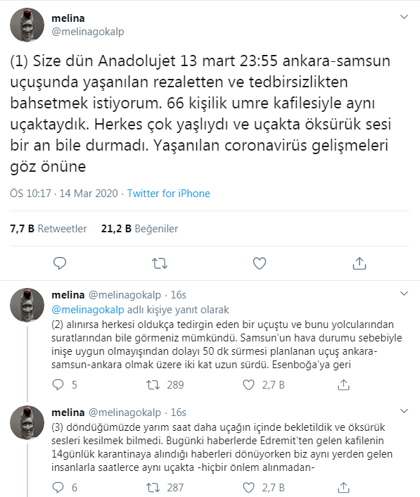 Twitter üzerinden yaşadığı tedbirsizliği anlatan ve Ankara-Samsun uçağında bulunan vatandaş konuyu şu şekilde açıkladı: "66 kişilik umre kafilesiyle aynı uçaktaydık. Herkes çok yaşlıydı ve uçakta öksürük sesi bir an bile durmadı. Yaşanılan coronavirüs gelişmeleri göz önüne alınırsa herkesi oldukça tedirgin eden bir uçuştu ve bunu yolcuların suratlarından bile görmeniz mümkündü. Samsun’un hava durumu sebebiyle inişe uygun olmayışından dolayı 50 dk sürmesi planlanan uçuş Ankara-Samsun-Ankara olmak üzere iki kat uzun sürdü.