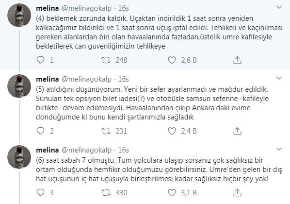 Uçaktan indirildik, 1 saat sonra yeniden kalkacağımız bildirildi ve 1 saat sonra uçuş iptal edildi. Tehlikeli ve kaçınılması gereken alanlardan biri olan havaalanında fazladan üstelik umre kafilesiyle bekletilerek can güvenliğimizin tehlikeye atıldığını düşünüyorum.