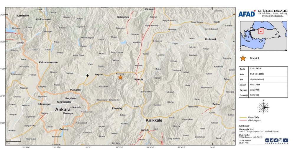 AFAD'ın Twitter hesabından yapılan bilgilendirmede, Ankara'nın Akyurt ilçesinde meydana gelen deprem sonrasında an itibariyle, olumsuz bir ihbarın bulunmadığı ve gelişmelerin takip edildiği bildirildi.