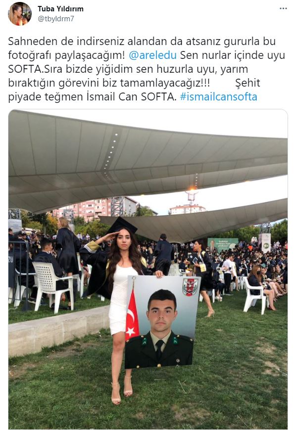 Yaşanan gerilimin ardından Şehit İsmail Can Softa'nın fotoğrafını içeriye sokmayı başaran Tuba Yıldırım isimli öğrenci, sosyal medya hesabından "Sahneden de indirseniz alandan da atsanız gururla bu fotoğrafı paylaşacağım" ifadesini kullandı.