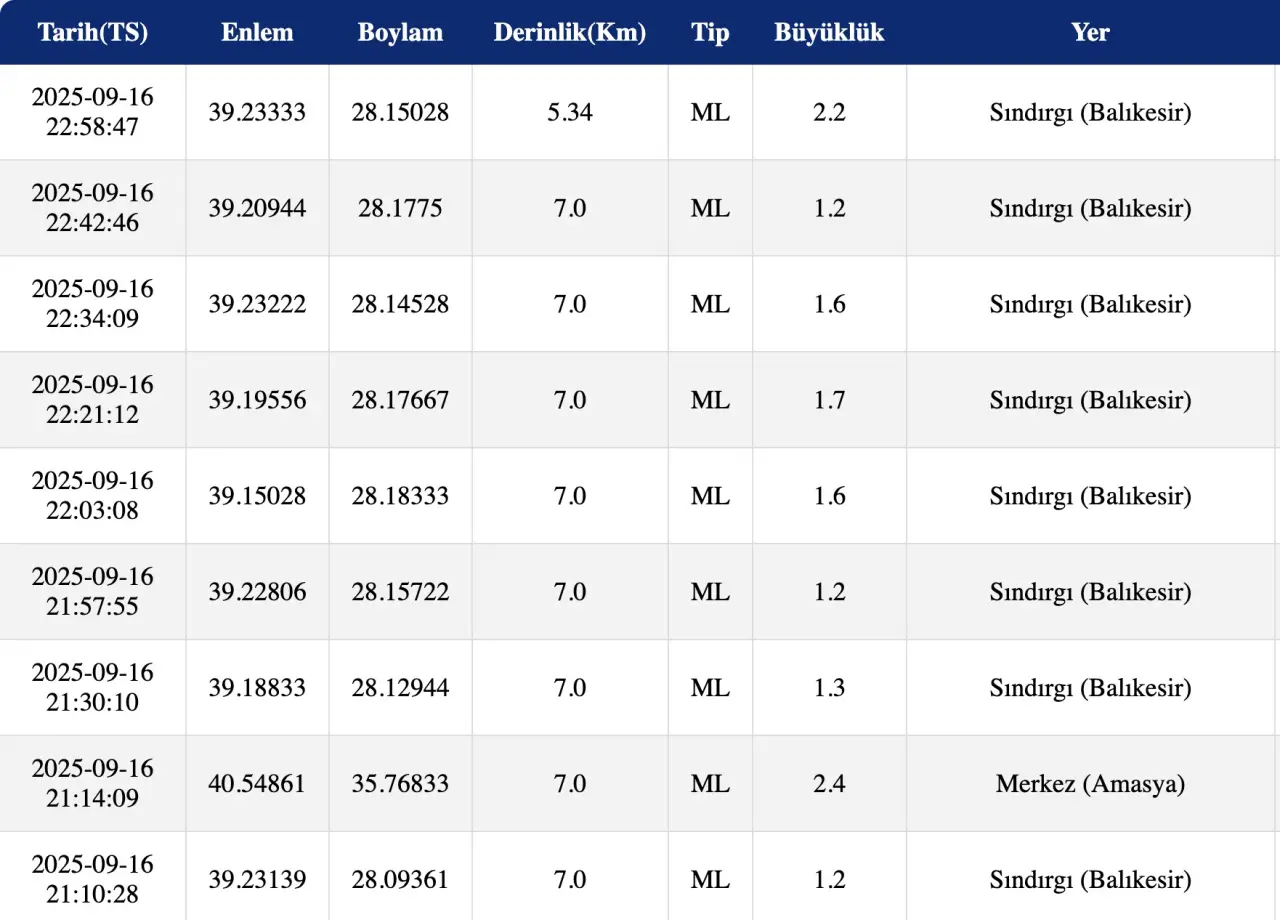 Kandilli Rasathanesi verilerine göre, Sındırgı’da gün içinde 1.2 ile 2.2 büyüklüğü arasında çok sayıda deprem kaydedildi. Saat 22.58’de gerçekleşen 2.2 büyüklüğündeki deprem, bölgedeki en şiddetli sarsıntı olarak öne çıktı. Yerin yaklaşık 5 kilometre derinliğinde oluşan bu sarsıntıyı, kısa aralıklarla gelen daha küçük depremler takip etti.