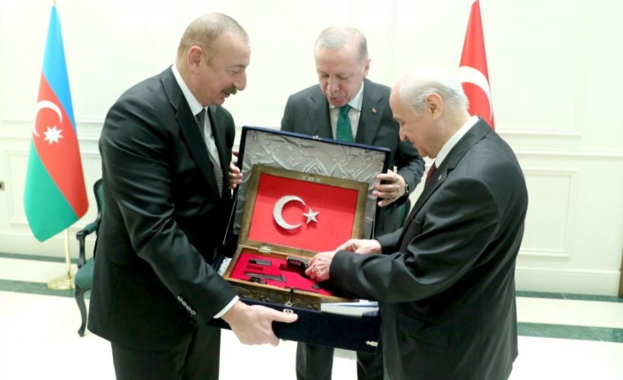 Bahçeli, Aliyev’e yerli üretim altın kabzalı silah hediye etti. Hediyenin üzerine “Karabağ Fatihi” yazıldı.