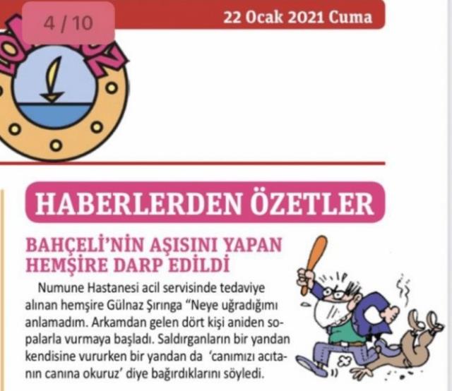 Gürses bu haberi gerçek sanarak konuğuna, "Siyasetin dili uzunca bir zamandır çok gergindi ve tansiyon çok yukarıdaydı. Yetmezmiş gibi sokağa da yansıdı. Bugün, çok olağanüstü bir haber okudum. Sayın Bahçeli'ye aşı yapan bir hemşire vardı. O hemşirenin darbedildiğini siz biliyor muydunuz? Ben de okudum ve aklım durdu. Numune Hastanesi acil servisinde tedavi altına alınmış bu hemşire hanım. Gülnaz Şırınga, 'Neye uğradığımı anlamadım. Arkamdan gelen 4 kişi aniden sopalarla vurmaya başladı. Kendisine vururken bir yandan da 'Canımızı acıtanın canına okuruz' diye bağırdıklarını söyledi. Sayın Bahçeli'ye aşı yaptığı için, onun canını acıttıklarını düşündükleri için bu kadıncağızı darbetmişler" dedi.