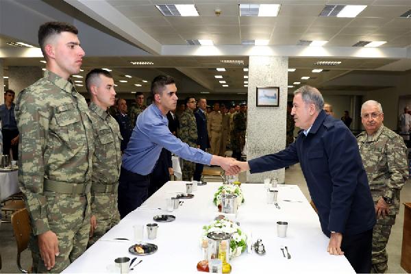 Milli Savunma Bakanı Hulusi Akar, beraberinde Genelkurmay Başkanı Orgeneral Yaşar Güler ve Kara Kuvvetleri Komutanı Orgeneral Ümit Dündar ile sınır birliklerinde gerçekleştirdiği inceleme ve denetlemelerin ardından Hatay'dan Ankara'ya döndü. Cumhurbaşkanlığı Muhafız Alay Komutanlığı'na giden Bakan Akar ve beraberindeki komutanlar, iftarı Mehmetçik ile birlikte yaptı. İftara Milli Savunma Bakanlığı Bakan Yardımcıları Şuay Alpay, Alpaslan Kavaklıoğlu ile Muhsin Dere de katıldı.