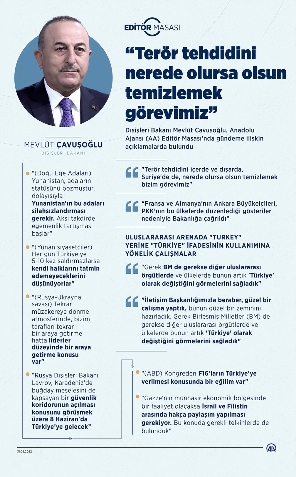 "Yunanistan, adaların statüsünü bozmuştur, dolayısıyla Yunanistan'ın bu adaları silahsızlandırması gerekir. Aksi takdirde egemenlik tartışması başlar."