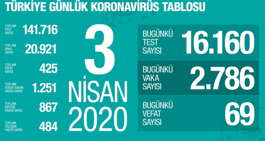 Son 24 saatte 16 bin 160 test yapıldı. 2786 pozitif vaka daha tespit edildi. 20 bin 921 toplam vaka. 69 hastamızı kaybettik.
