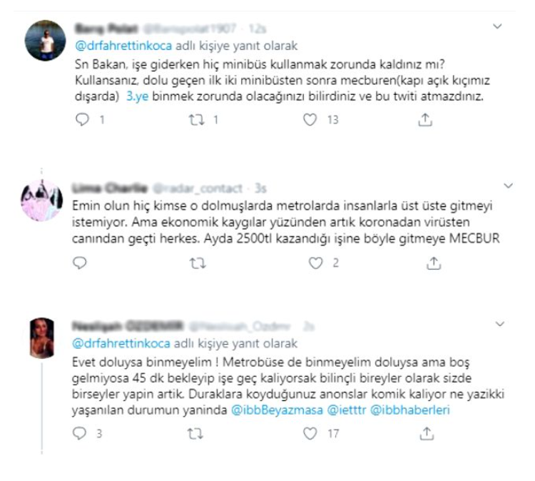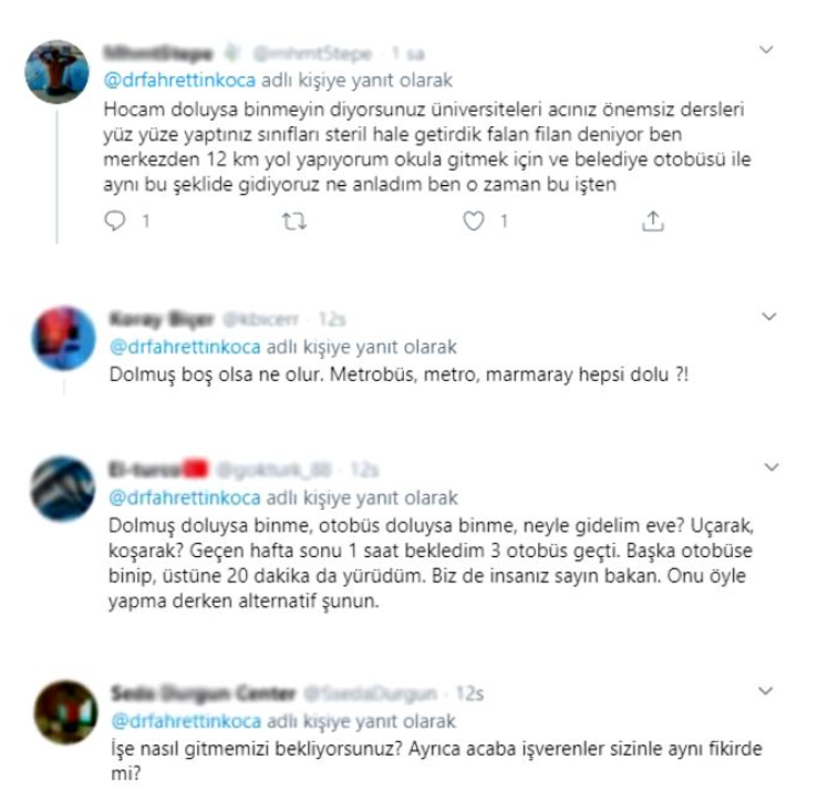 Sosyal medya hesabından kalabalık bir dolmuşun fotoğrafını paylaşan Bakan Koca, "Doluysa, Binmeyin! İstanbul'da dolmuş şoförleri içinden bazılarının, salgına rağmen, kapasitelerinden fazla yolcu aldıkları yönünde şikâyetler artmaya başladı. Lütfen, fazla yolcu taşıyan dolmuşa binmeyin. Yolcu kapasitesi denetimi yapan Emniyet birimlerine yardımcı olsun" ifadelerini kullandı.