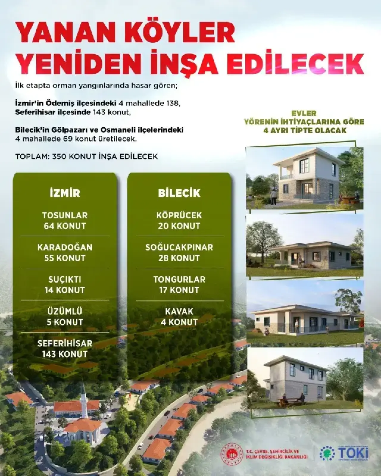 Bakan Kurum, yaptığı yazılı açıklamada, 11 ilde çıkan yangınlardan etkilenen yapı sayısının 396'sı konut olmak üzere toplam 632 bağımsız birime ulaştığını belirterek; "İzmir ve Bilecik'te AFAD hak sahipliği çalışmalarını tamamladı. Hak sahibi vatandaşlarımız için Bilecik'te 69, İzmir Ödemiş'te 138, Seferihisar'da 143 olmak üzere toplamda 350 konutun ihale sürecini başlattık. Ağustos ayı içinde temelleri atacağız, en geç 1 yıl içinde de konutlarımızı afetzede kardeşlerimize teslim edeceğiz" ifadelerini kullandı.