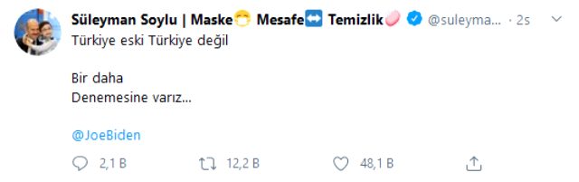 Soylu'nun ABD Başkan adayı Joe Biden'in Türkiye'ye yönelik çirkin sözleriyle ilgili attığı tweet sosyal medyada paylaşım rekoru kırdı.