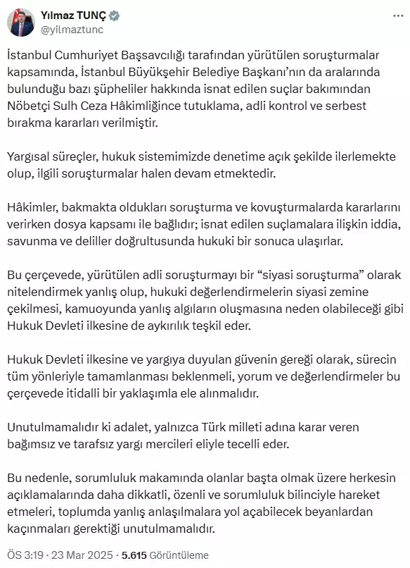 İstanbul Büyükşehir Belediye Başkanı Ekrem İmamoğlu’nun da tutuklandığı yolsuzluk soruşturmasına dair resmi açıklama, Adalet Bakanı Yılmaz Tunç’tan geldi. Bakan Tunç, devam eden soruşturmalara ilişkin kamuoyunda oluşan değerlendirmelere karşı uyarıda bulundu.