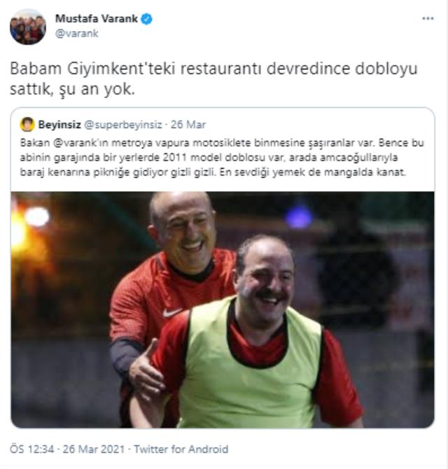 'Beyinsiz' isimli Twitter kullanıcısı, Mustafa Varank ile Mevlüt Çavuşoğlu'nun birlikte bir fotoğrafını paylaşarak "Bakan Varank'ın metroya vapura motosiklete binmesine şaşıranlar var. Bence bu abinin garajında bir yerlerde 2011 model doblosu var, arada amcaoğullarıyla baraj kenarına pikniğe gidiyor gizli gizli. En sevdiği yemek de mangalda kanat" yazdı.