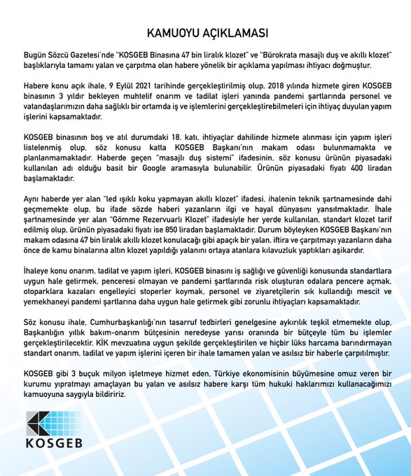Başkanlığın yıllık bakım-onarım bütçesinin neredeyse yarısı oranında bir bütçeyle bu işlemlerin gerçekleştirildiği vurgulanan açıklamada, "KİK mevzuatına uygun şekilde gerçekleştirilen ve hiçbir lüks harcama barındırmayan standart onarım, tadilat ve yapım işlerini içeren bir ihale tamamen yalan ve asılsız bir haberle çarpıtılmıştır. KOSGEB gibi 3, 5 milyon işletmeye hizmet eden, Türkiye ekonomisinin büyümesine omuz veren bir kurumu yıpratmayı amaçlayan bu yalan ve asılsız habere karşı tüm hukuki haklarımızı kullanacağımızı kamuoyuna saygıyla bildiririz." ifadeleri kullanıldı