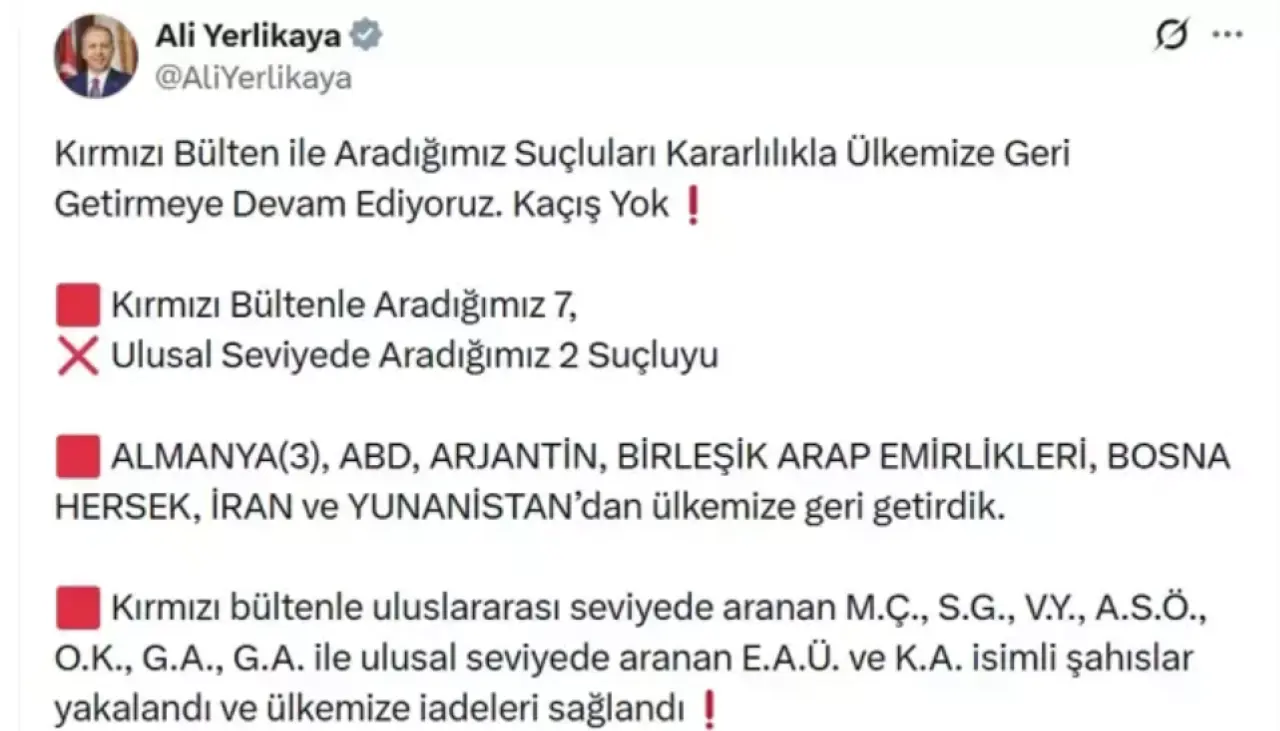 İçişleri Bakanı Ali Yerlikaya, kırmızı bültenle aranan 7 ve ulusal seviyede aranan 2 suçlunun; Almanya, ABD, Arjantin, Birleşik Arap Emirlikleri, Bosna Hersek, İran ve Yunanistan'dan yakalanarak Türkiye'ye getirildiğini duyurdu.