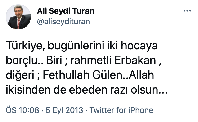 Anadolu Ajansı'ndan bakanlara sorduğu sorular nedeniyle kovulan Musab Turan'ın babası Ali Seydi Turan'ın, sosyal medya hesabından Fethullah Gülen'i övdüğü tweetleri ortaya çıktı.