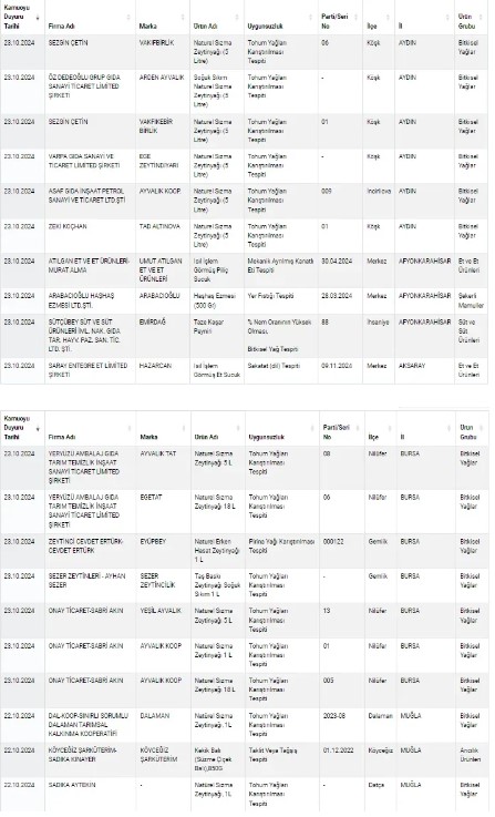 Güncel listede en dikkat çeken ürün, Türkiye'deki birçok market zincirinde satılan popüler bir zeytinyağı markası oldu. Vakıfbirlik markası altında üretilen 5 litrelik naturel sızma zeytinyağlarına tohum yağı karıştırıldığı tespit edildi. Bakanlık, sakıncalı ürünler için toplatma kararı verirken, listeye çok sayıda et ve süt ürünü de eklendi.