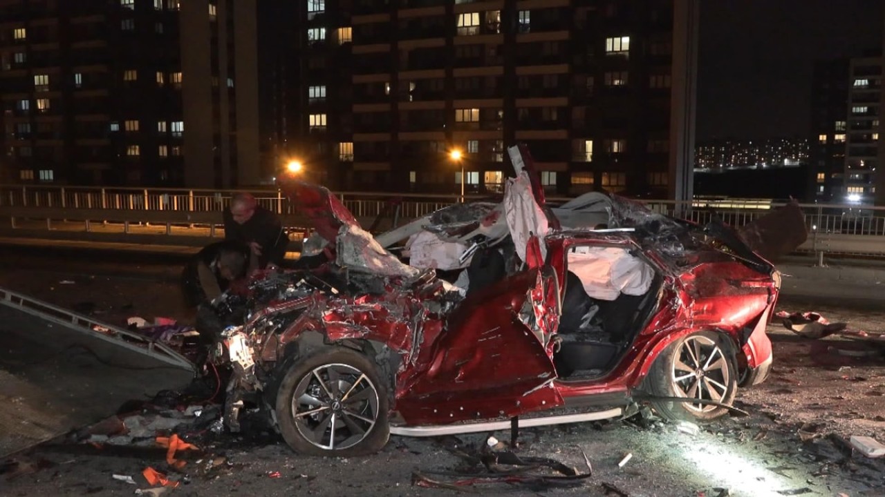İstanbul Başakşehir'de sürücüsü tespit edilemeyen 34 UB 7161 plakalı otomobil refüjü aşarak karşı şeride geçti. 34 HZR 561 plakalı araca çarpan otomobil daha sonra bariyerlere vurdu.