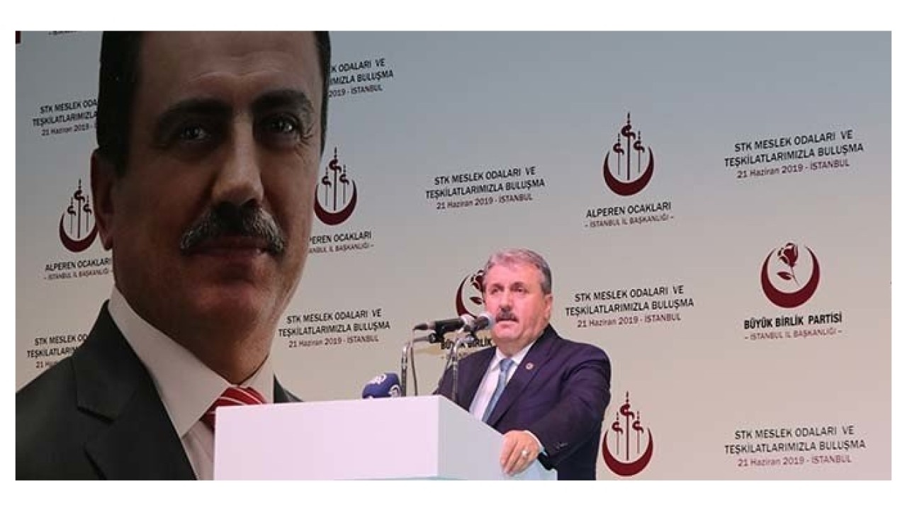"31 Mart Cumhur İttifakı adayını destekleyeceğimizi ilan ettik ve destekledik. 39 ilçenin 15'inde de biraz önce dile getirdiğim hassasiyetler çerçevesinde aday çıkarmadık. Buna rağmen 100 bin oyun üzerine çıktık. 16 Nisan referandumunda nerede durmuşsak, 24 Haziran seçimlerinde nerede durmuşsak, 31 Mart seçimlerinde nerede durmuşsak, 23 Haziran'da seçimlerinde de orada duruyoruz, yani Cumhur İttifakı'nın yanında durduk ve durmaya devam edeceğiz. Büyük Birlik Partililer olarak 15 Temmuz'da sokakta kurulan ve daha sonra da Yenikapı ruhuyla taçlandırılan Cumhur İttifakı ruhuna sadığız. Bu sadakatimizi her zaman gösterdik ve bundan sonra göstermeye devam edeceğiz. Bu pazar günü yenilenecek olan İstanbul Büyükşehir Belediyesi seçimleri, sadece bir belediye seçimleri olmanın ötesine geçmiştir. 2 adayın yarıştığı bir seçimin ötesine geçmiştir. 2 partinin yarıştığı bir seçimin ötesine geçmiştir. Çünkü bu seçim üzerinden Türkiye'yi siyasi ve ekonomik bir istikrarsızlığa, kaosa ve krizlere sürüklemek isteyen, yani geçmişin özlemi içinde olanlar bunu yapmışlardır. Bu seçimler şayet onların istediği gibi çıkarsa Türkiye'yi siyasi istikrarsızlığa yöneltmek amacındadırlar. Türkiye'de yeniden sistem tartışmasını gündeme getirmek istiyorlar. Burada aslında hedeflenen Türkiye'nin başarıyla yürüttüğü terörle mücadeleyi inkıtaya uğratmaktır ve durdurmaktır."