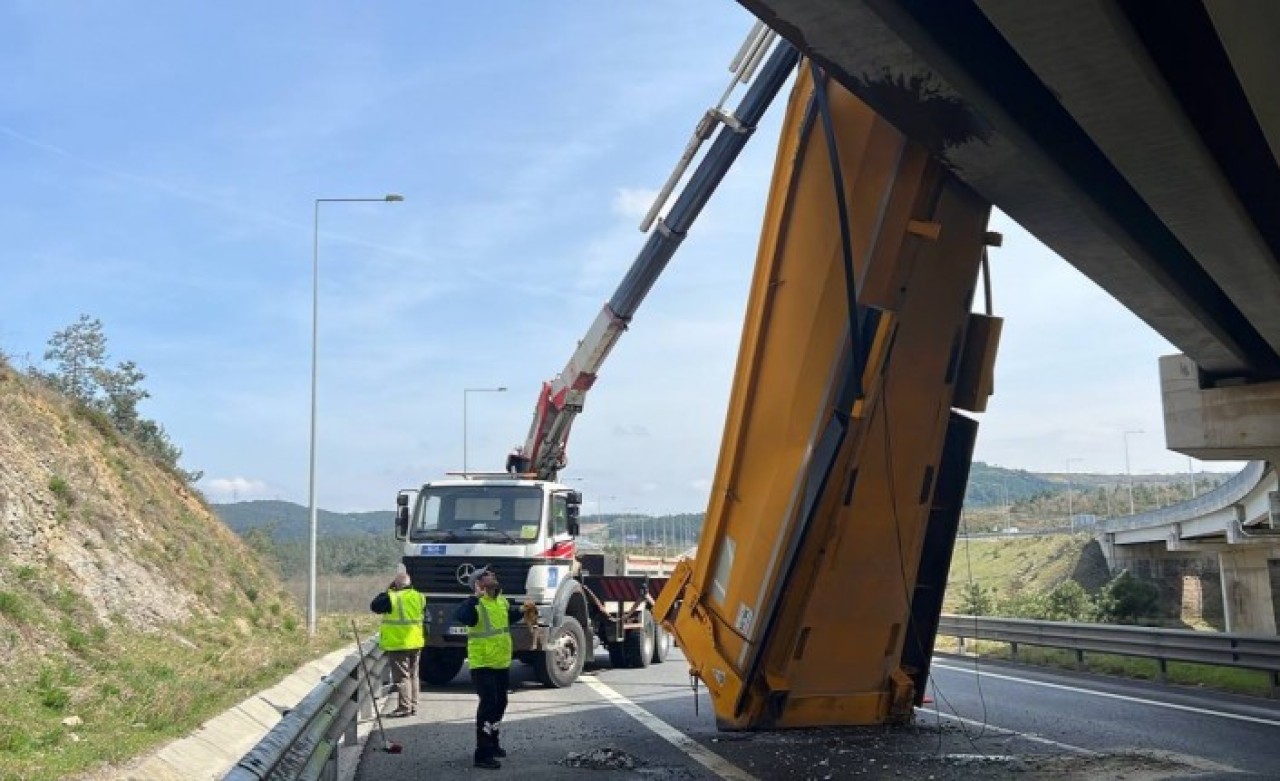 Kuzey Marmara Bağlantı Yolu'ndan Ümraniye istikametine seyreden 34 ERJ 819 plakalı kamyonun dorsesi, henüz bilinmeyen nedenle açıldı, sürücü durumu fark etmedi.