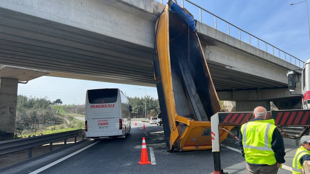 Kamyonun açık dorsesi, viyadüğe çarptı.