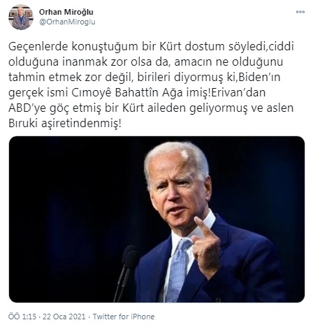 AK Parti eski milletvekili ve MKYK üyesi Orhan Miroğlu, sosyal medya hesabından ABD'nin yeni başkanı Joe Biden'la ilgili ilginç bir iddia ortaya attı.