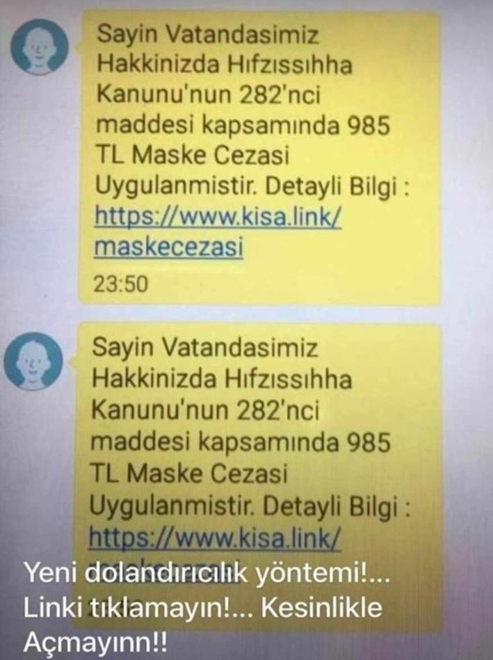 Habertürk'teki habere göre; cep telefonlarına gönderilen kısa mesajda "Sayın vatandaşımız hakkınızda Hıfzısıhha Kanunu'nun 282'nci maddesi kapsamında 985 lira maske cezası uygulanmıştır" denilerek verilen linke tıklanması bekleniyor.