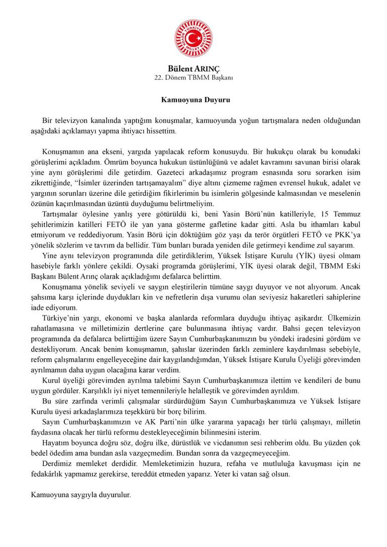 "Sayın Bülent Arınç, Cumhurbaşkanlığı Yüksek İstişare Kurulu üyeliği görevinden ayrılmayı talep etmiş, sayın Arınç'ın talebi Sayın Cumhurbaşkanımız tarafından kabul edilmiştir. Kamuoyuna saygıyla duyurulur."