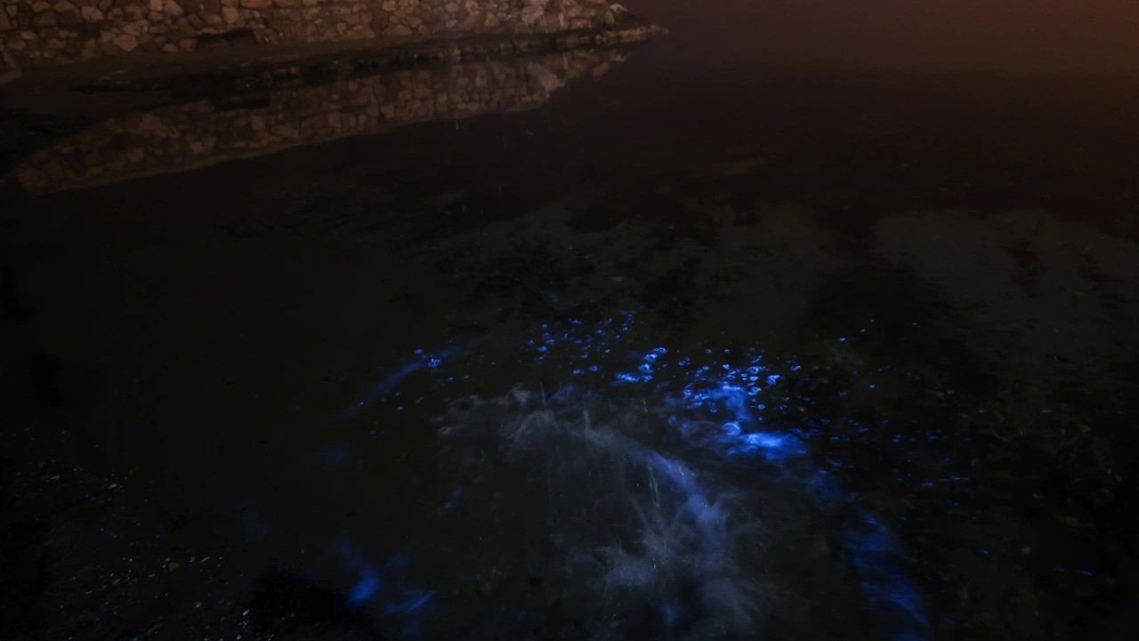 Deniz tabanında özellikle kahverengi birikmelerin bulunduğu alanlarda, suya temas edilmesiyle parlak mavi ışığın çıktığı görüldü.