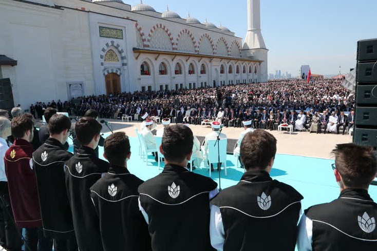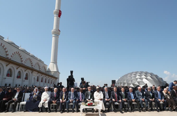 Yurt dışından ülkemizi teşrif ederek bu sevinçli anımıza ortak olan kıymetli misafirlerimize, şahsım, milletim adına hoş geldiniz diyorum. Bugün bizleri bir araya getiren, gönüllerimizi buluşturan yüce Allah’a hamd-ü senalar ediyorum. Resmi açılışını yaptığımız Büyük Çamlıca Camimizin İstanbul için ülkemiz için hayırlara vesile olmasını diliyorum.
