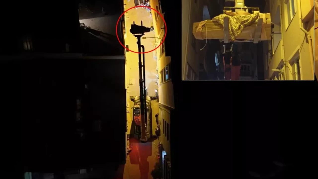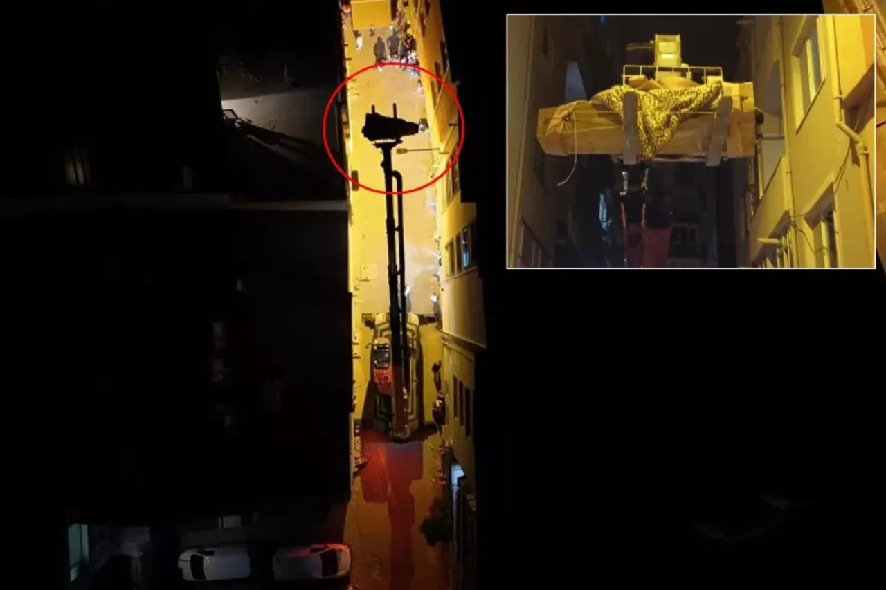 Ancak yaklaşık 165 kilo olduğu belirtilen cenazenin taşınmasında zorluk yaşanınca farklı bir çözüm uygulandı. Tabut, vinç yardımıyla beşinci kata çıkarıldı. Ardından cenaze dikkatlice tabuta yerleştirildi ve aynı vinçle tekrar aşağı indirilerek cenaze nakil aracına yerleştirildi. Polis, ölümün nedeni ile ilgili detaylı inceleme başlattı.