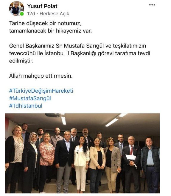 “Tarihe düşecek bir notumuz, tamamlanacak bir hikayemiz var. Genel Başkanımız Sn Mustafa Sarıgül ve teşkilatımızın teveccühü ile İstanbul İl Başkanlığı görevi tarafıma tevdi edilmiştir. Allah mahçup ettirmesin.”