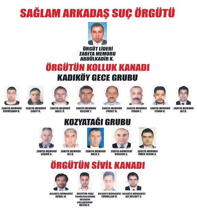 "Sağlam Arkadaş Suç Örgütü" ismi verilen ve yedi ay boyunca titizlikle yürütülen teknik dinlemeler sonrası operasyonla çökertilen şebekenin en tepesinde "Örgüt Lideri" olarak Zabıta Memuru Abdülkadir K. bulunuyor.