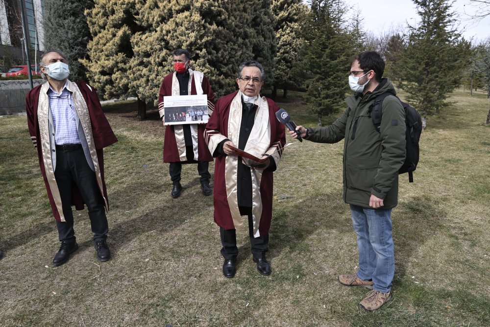 Çin Büyükelçiliği önündeki basın açıklamasına, Hacı Bayram Veli Üniversitesi öğretim üyeleri İlyas Doğan, Abdürreşit Celil Karluk, Tevfik Erdem ile Kırıkkale Üniversitesi Öğretim Üyesi Çağatay Sarp katıldı.